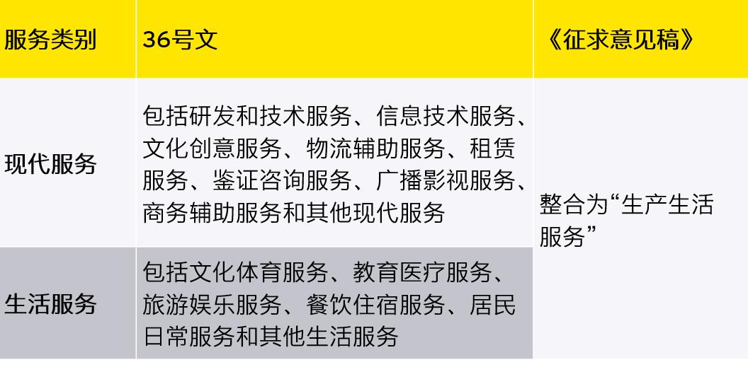 《征求意见稿》第二条拟明确货物、服务、无形资产、不动产的法定定义,并将服务细分为交通运输、邮政、电信、建筑、金融、生产生活服务。其中“生产生活服务”涵盖了原财税[2016]36号文(以下简称“36 号文”)的现代服务业和生活服务业内容,具体如下: